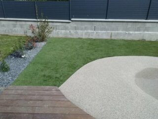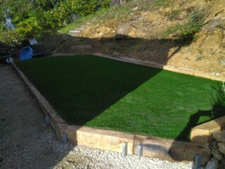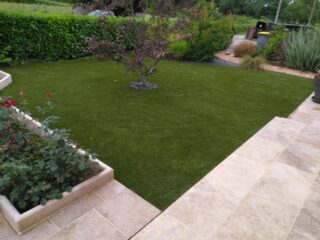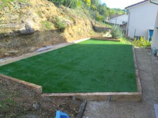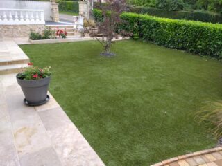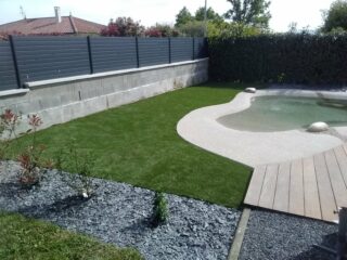 Nos projets d’engazonnement montrent la pose en rouleaux ou en semis après un terrassement et un nivellement soigneux, pour une pelouse dense et durable. Pour les zones à faible entretien ou usage intensif, la galerie présente des poses de gazon synthétique haute qualité, parfaitement jointées et posées sur support drainant.